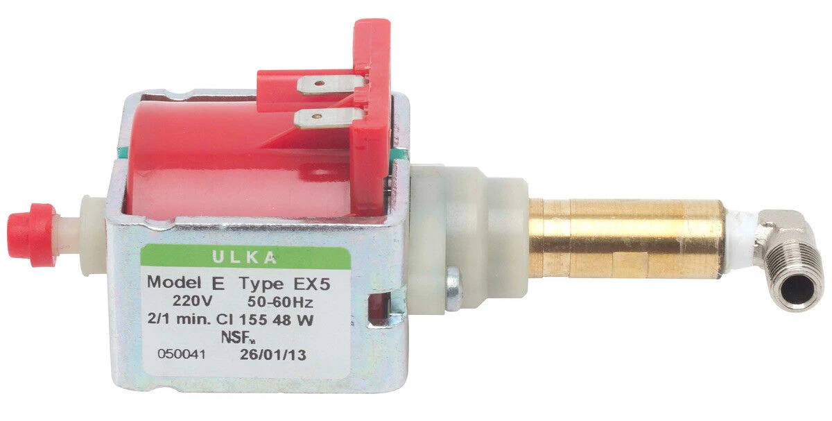 De Ulka vibratiepomp model E, type EX5 wordt gebruikt in diverse espressomachines. De pomp produceert een gemiddelde druk van 15 bar en heeft een pompcapaciteit van 650 ml per minuut. De koppeling aan de ingang heeft zaagtandprofiel met een diameter 7,5 mm. De messing uitgangskoppeling is voorzien van een inwendige schroefdraad en heeft een diameter van 9 mm. Het onderdeel wordt geleverd met een fitting voor een rvs slang. Gebruik het onderdeel om een oude pomp te vervangen.