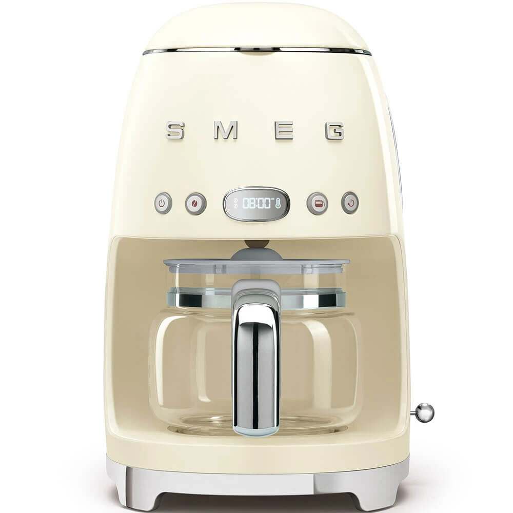 Het SMEG 50’s style koffizetapparaat is vervaardigd van hoogwaardige kunststof in een jaren ’50 stijl vormgegeven. Het filter heeft een handvat en is daardoor gemakkelijk uit de houder te halen om schoon te maken. Door de timer is de starttijd van het apparaat in te stellen, zodat u op de gewenste tijd koffie heeft en de 4-kopsfunctie is afgestemd op een kleinere waterhoeveelheid. Na de koffiedoorloop houdt het apparaat nog 1 uur warm.